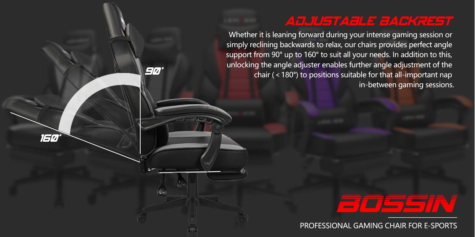 DetailThe Bossin gaming chair is designed for your every need! The gaming chair matches all locations. 360° Swivel and smooth racing caster wheels for mobility; 90°-180° reclining for working, gaming, reading, or napping; retractable footrest for relaxing; adjustable seat height, 400 lbs. capacity; head pillow and lumbar pillow for all body shapes. The winged back provides multi-point body contact to share the pressure and save your spine and lumbar with ergonomic back and massage support. Lean your legs more comfortably with a bucket seat design. The side wing frame has been thinned and contains a more soft filling. Alloy frame covered in quality PU leather and 6 inches of high-density foam for comfort. It is stable enough to serve for years.