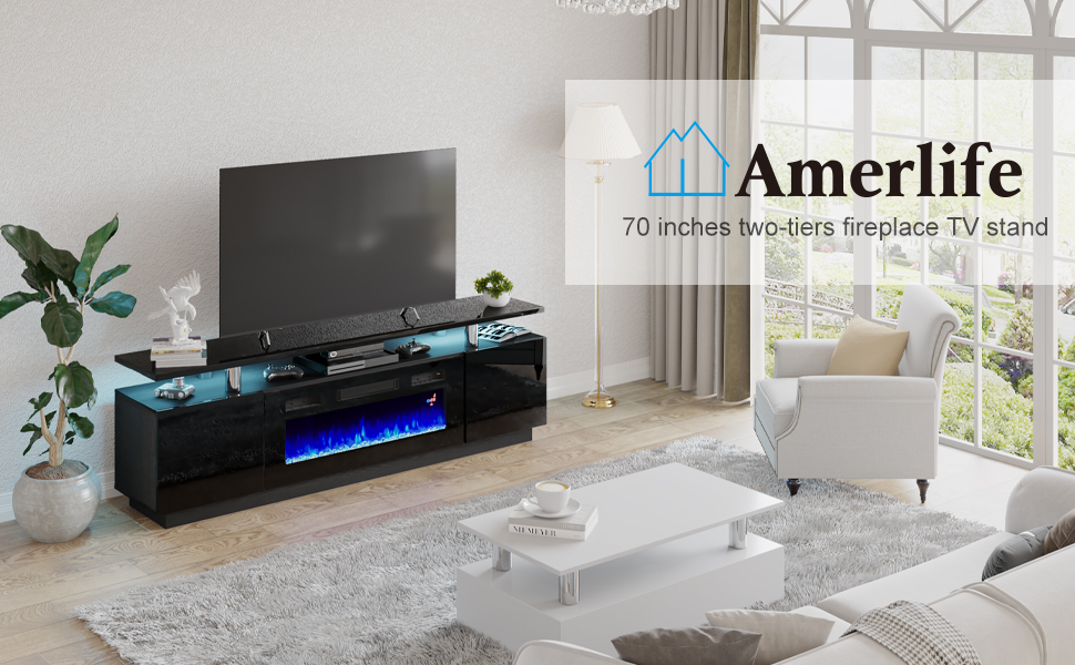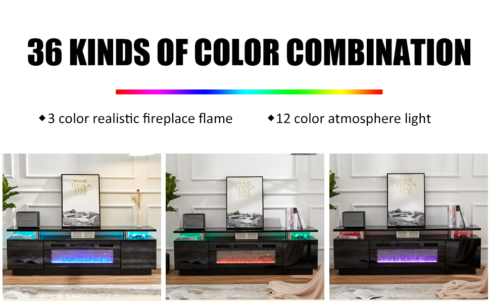 【Furniture】Fireplace TV Stand with 36" Fireplace, 70" Modern High Gloss Entertainment Center LED Lights
